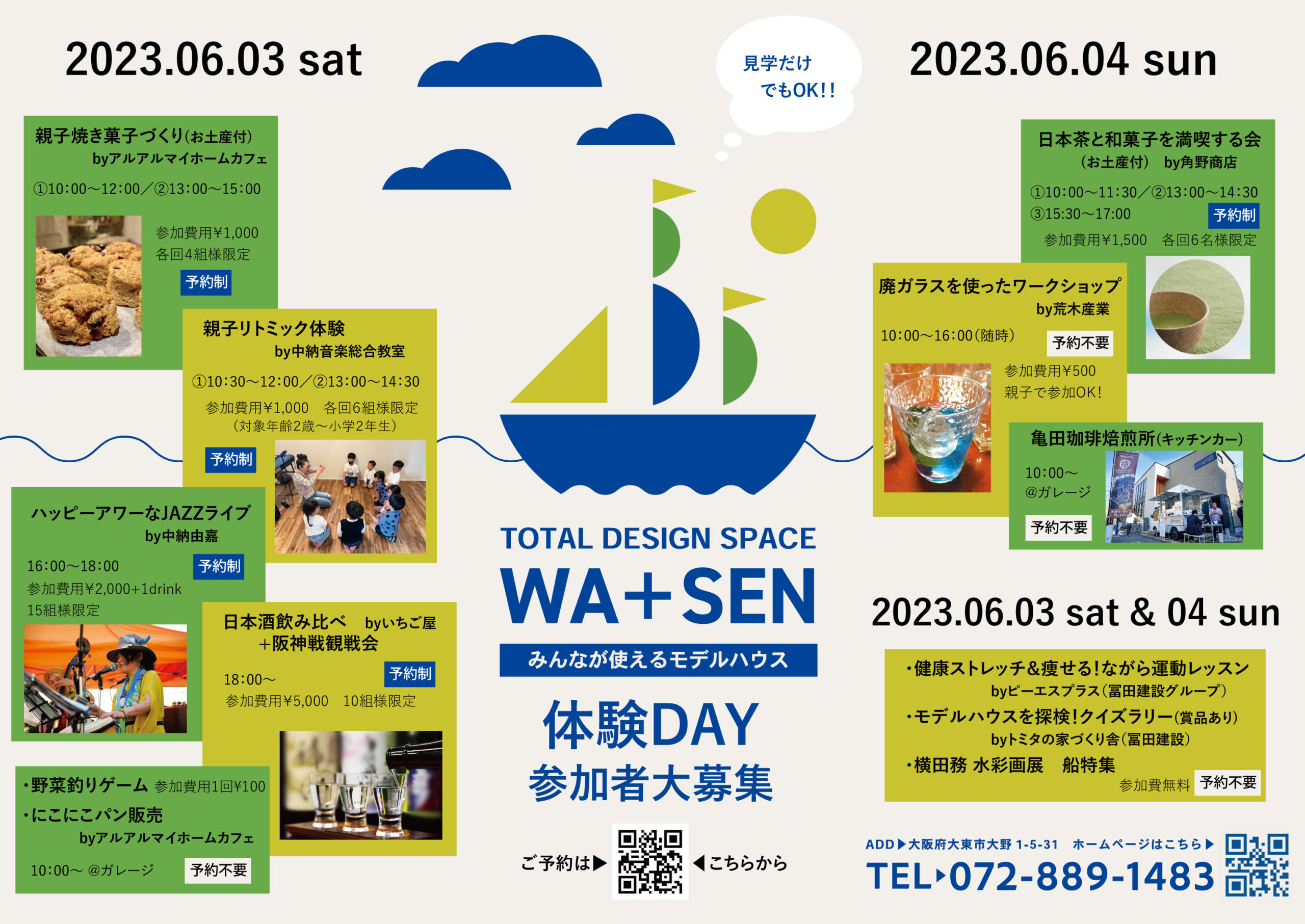 親子焼菓子づくり(¥1,000) 定員4組 10:00~12:00 親子焼菓子づくり(¥1,000) 定員4組 13:00~15:00 親子リトミック体験(¥1,000) 定員6組 10:30~12:00 親子リトミック体験(¥1,000) 定員6組 13:00~14:30 ハッピーアワーなJAZZライブ(¥2,000+1drink) 定員15名 16:00~18:00 日本酒飲み比べ+阪神戦観戦会(¥5,000) 定員10名 18:00~ |